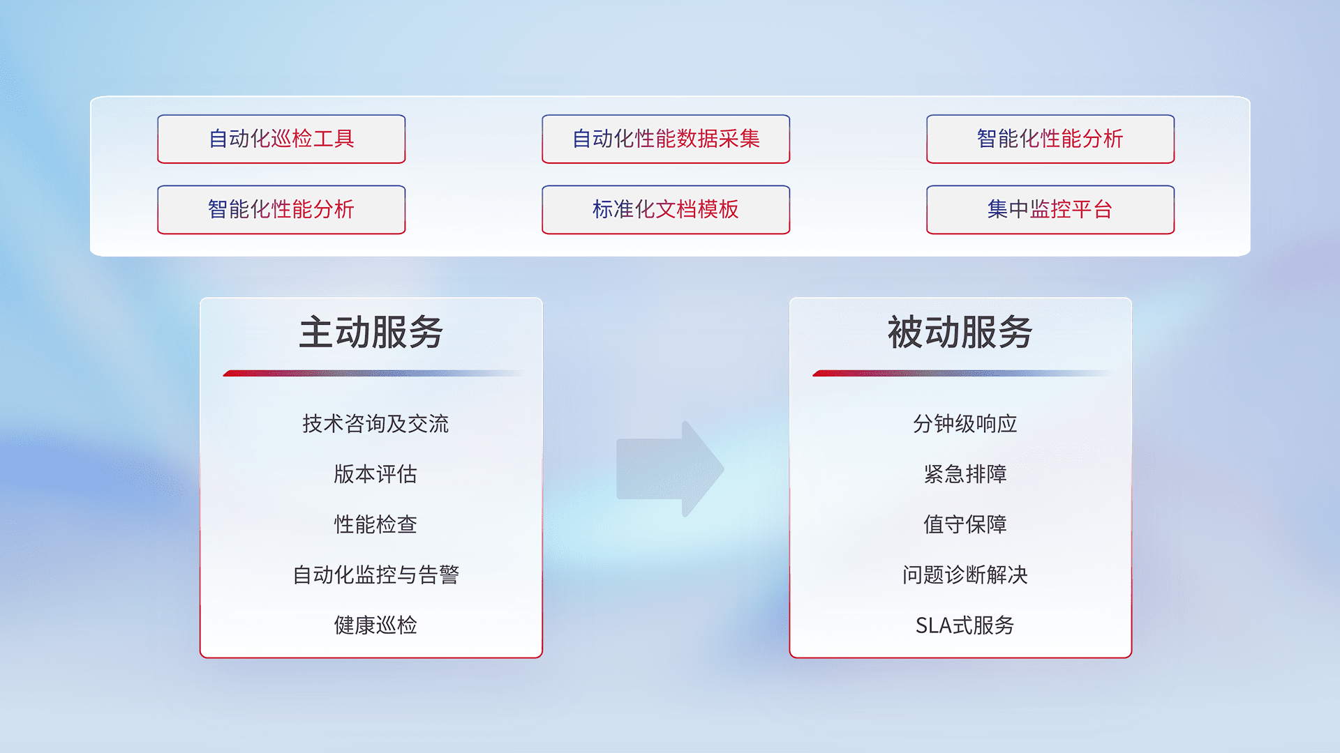 智能化工具和标准化文档,,,保障服务质量,,提供主动服务(包含技术咨询、、、、版本评估、、性能检查、、自动化监控与告警、、健康巡检)和被动服务包含(分钟级响应、、、紧急排障、、值守保障、、、问题诊断解决、、SLA服务)。。